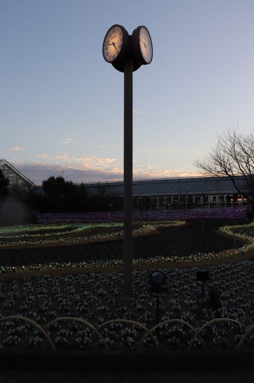 点灯時刻は、2019年5月6日までのイルミネーション点灯期間中、日没時刻に合わせて少しづつ遅くなるということです。