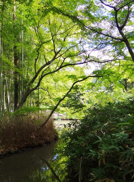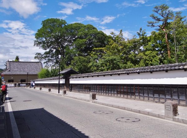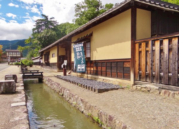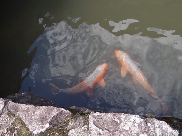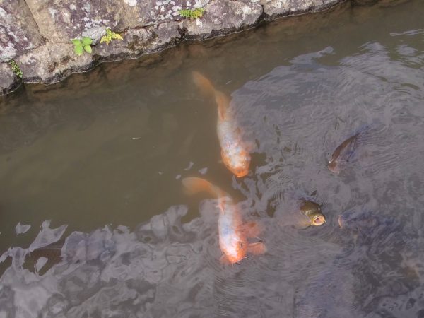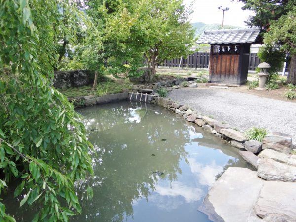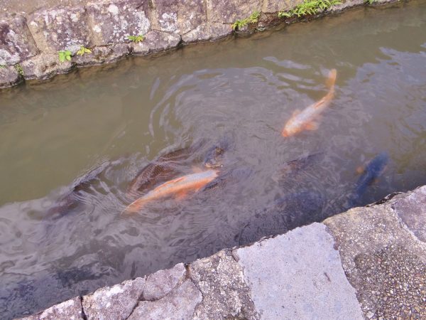 - 長屋門形式の表門。手前の川に鯉がゆったりと泳いでいました。鯉は昔も今も変わらない生活をしているのでしょうか?