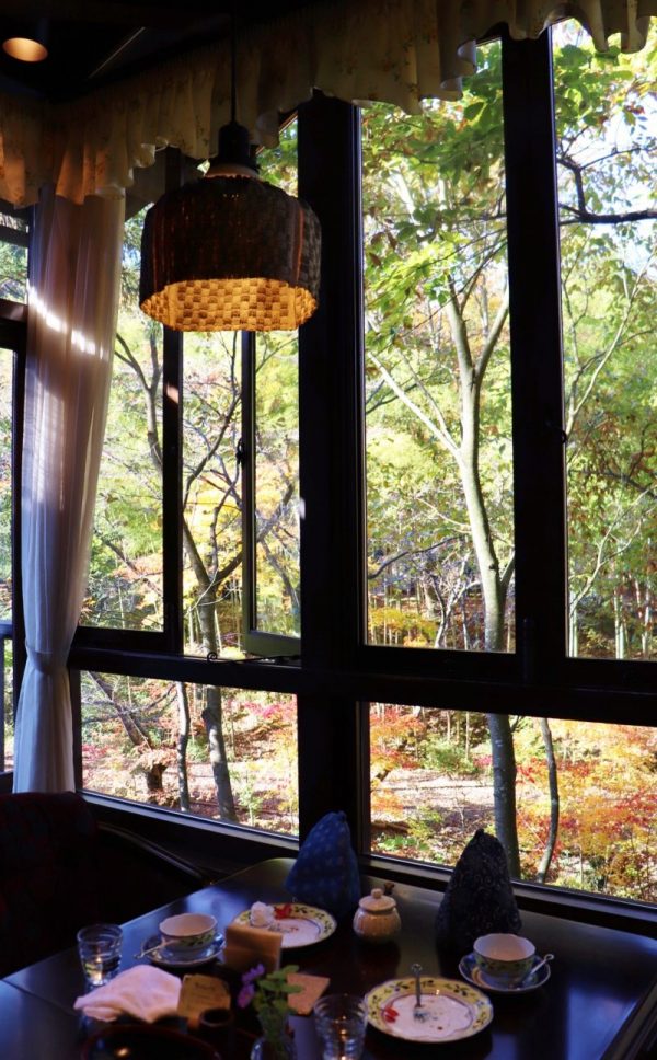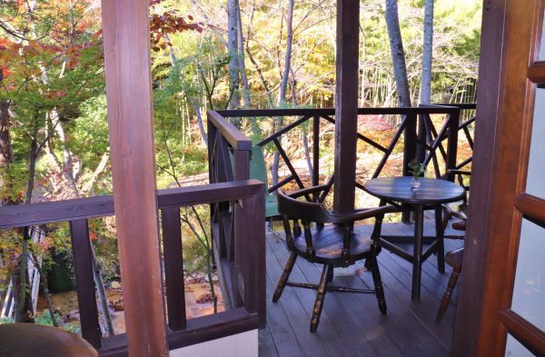 洒落た窓の外には紅葉した木々、直ぐ眼下には川が流れる。