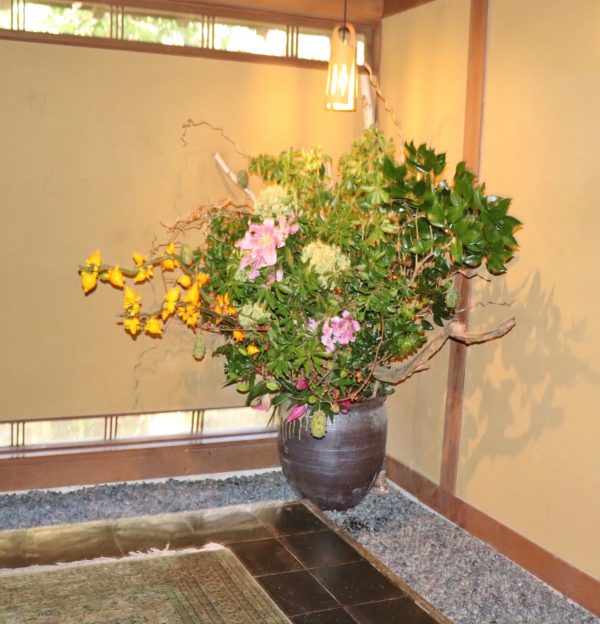 ティーサロンとしての個室が幾つかあり、一階からは建物の脇を流れる川と紅葉のモミジが、また二階からは高く伸びた紅葉の木々を愛でることができる。