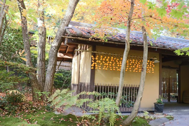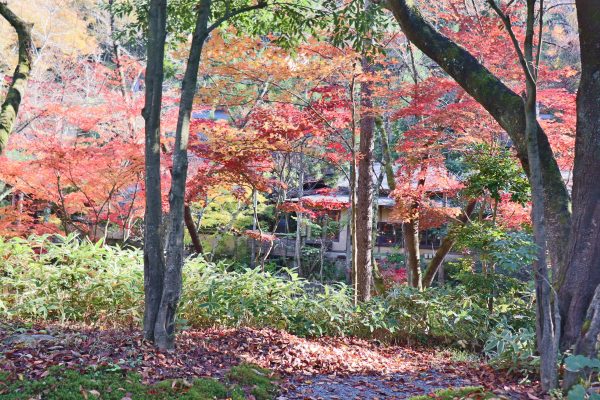 奥の建物は、ティーサロン「櫓(やぐら)」。その窓にも紅葉の木々が映る。