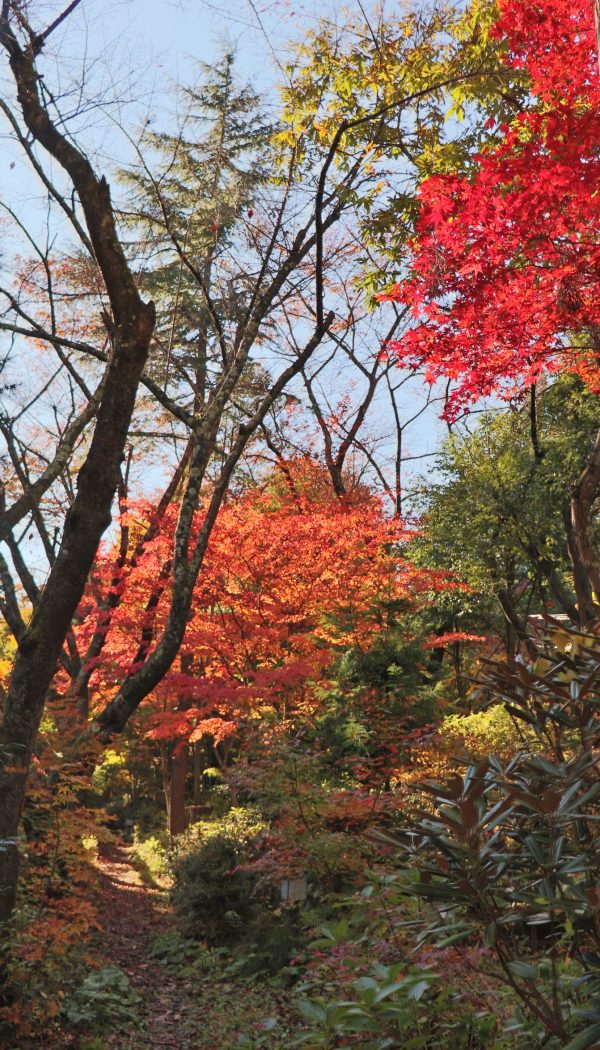 時折、ヒラ~リ、ヒラ~リと風もないのに静かに舞い落ちる赤や黄色の葉が、日の光を浴びてキラキラと輝く。