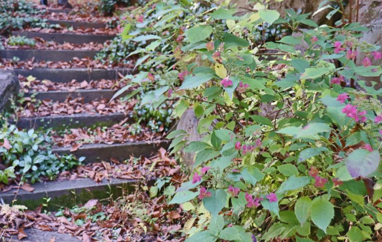 - 山紫陽花と散歩道階段に散り積もった落ち葉