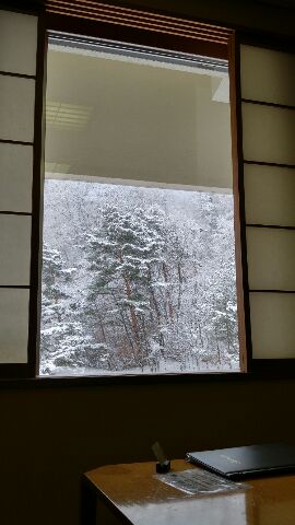朝障子を開けると、外は雪が降っていて、まるで日本画のような世界がそこにありました。