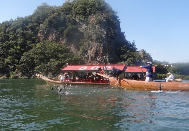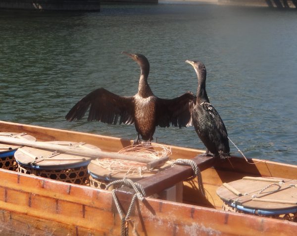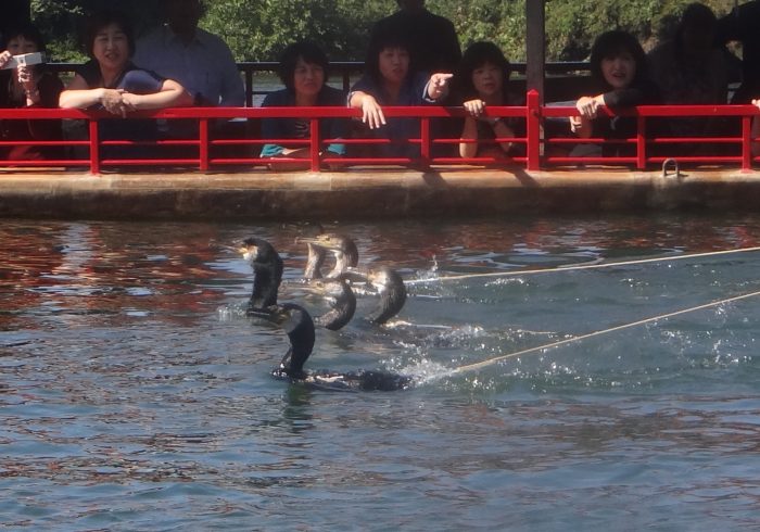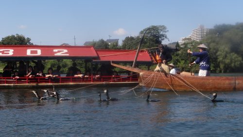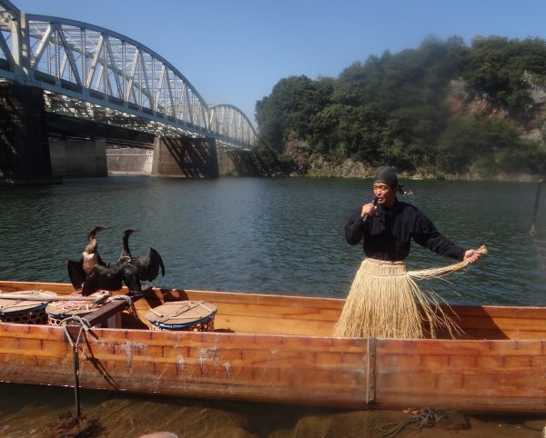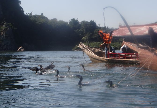 訓練された鵜(海鳥の一種、海鵜)が、首に手縄(タナワ)をつけ、舟から鵜匠の巧みな手縄さばきにより水中にもぐり、鮎などの川魚を捕らえます。