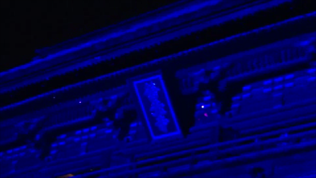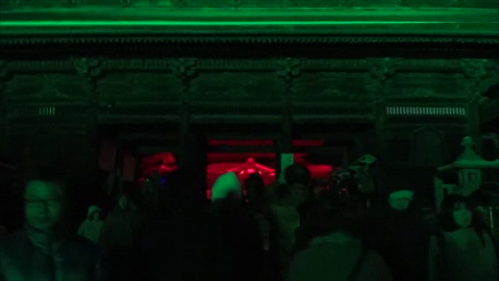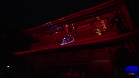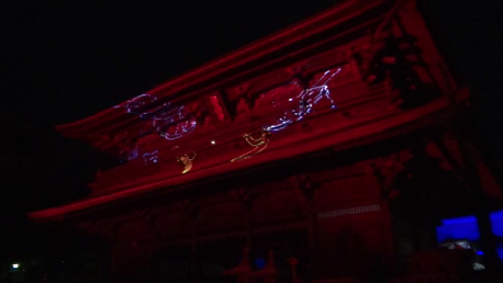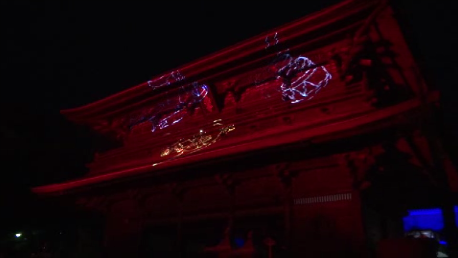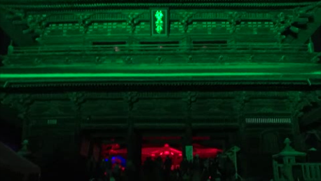 レーザーで幻想的に演出された善光寺山門。このレーザー演出は、初日だけのスペシャルライトアップ。