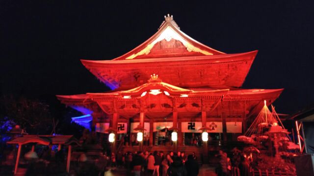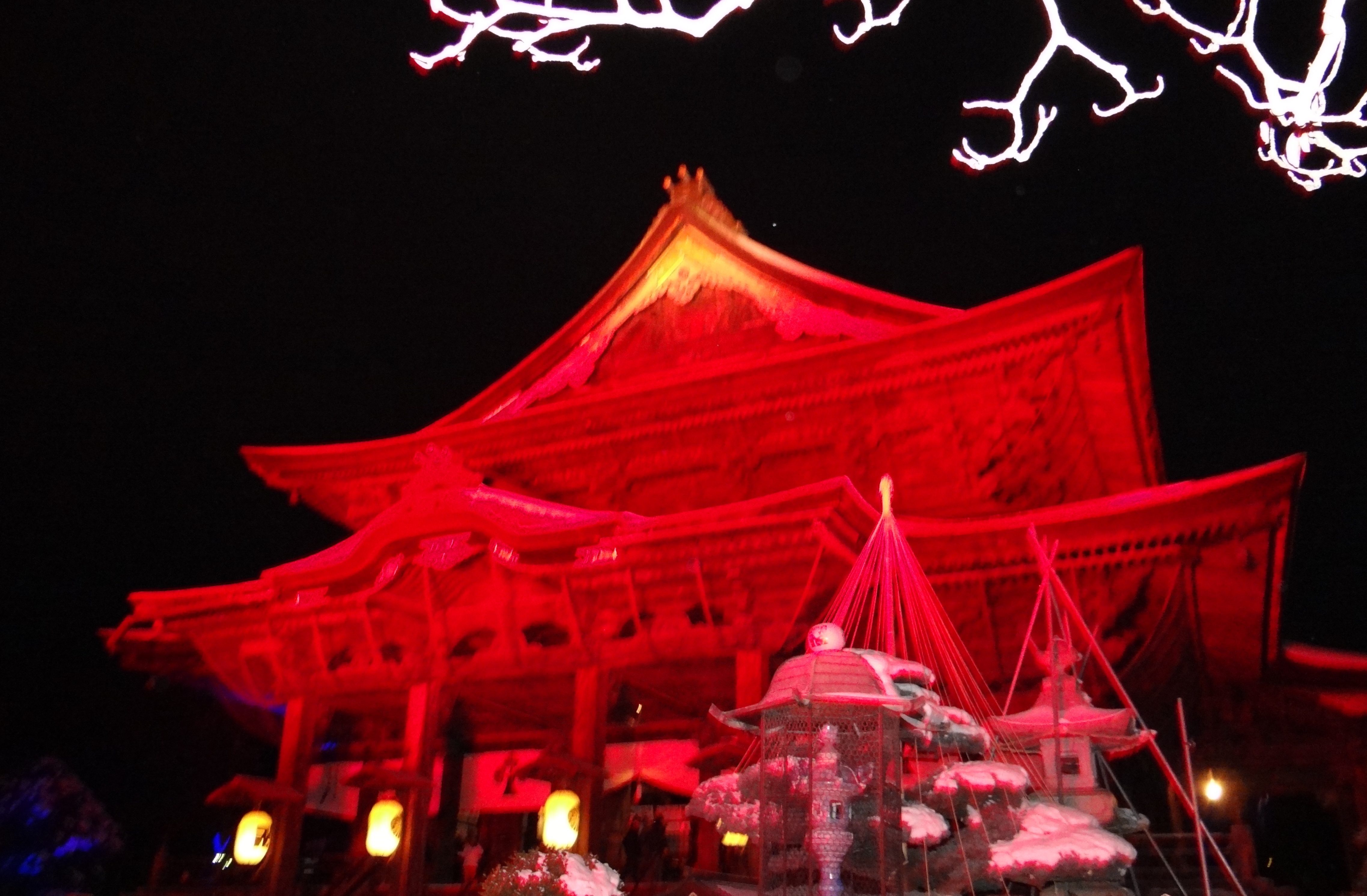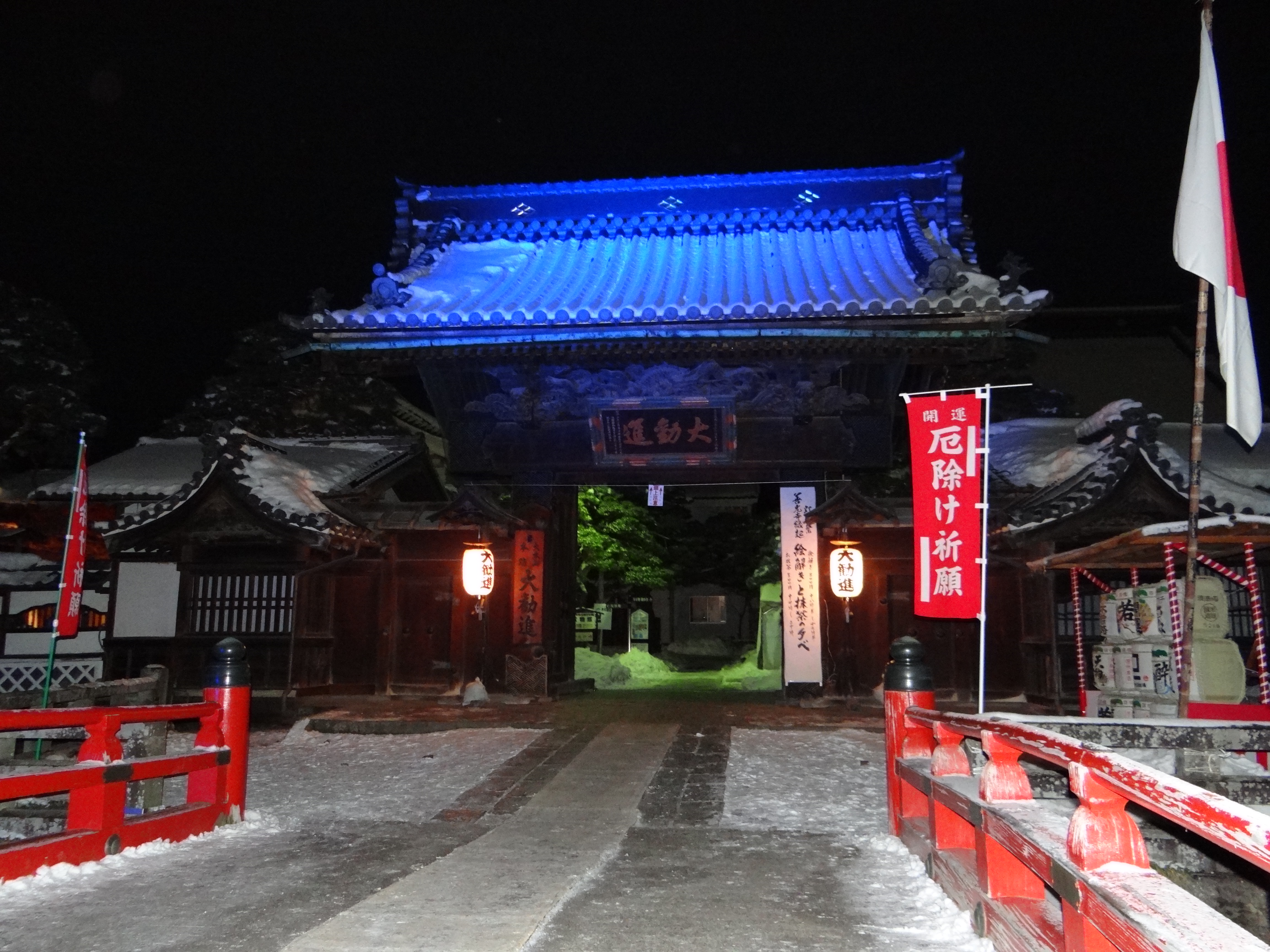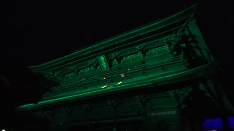 善光寺本堂、山門(サンモン)、大勧進(ダイカンジン)などをオリンピックカラー5色にLEDでライトアップ。