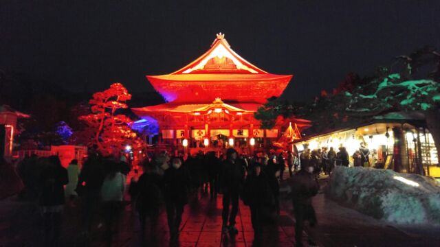 山門の先に見える赤くライトアップされた建物は、善光寺本堂。