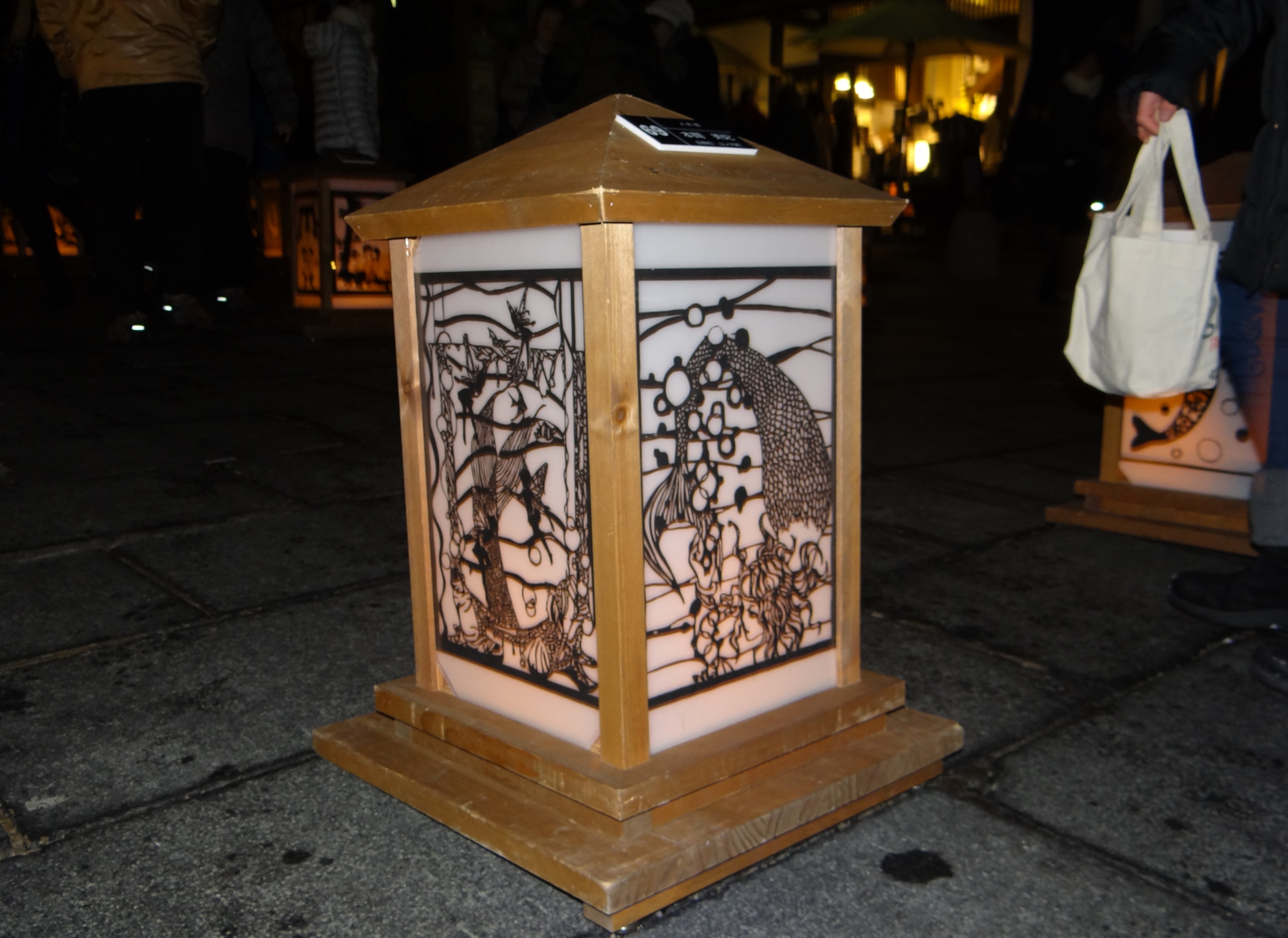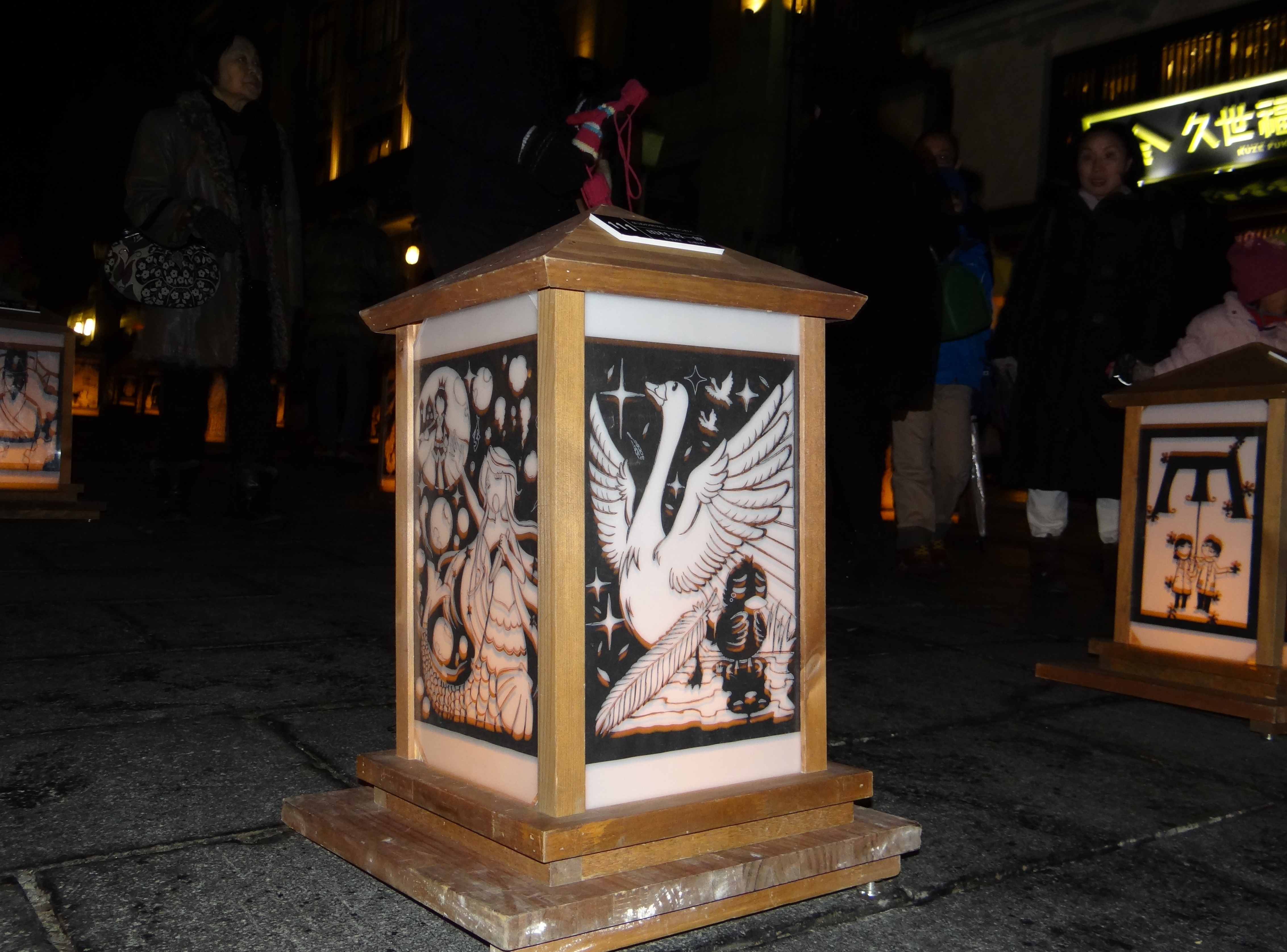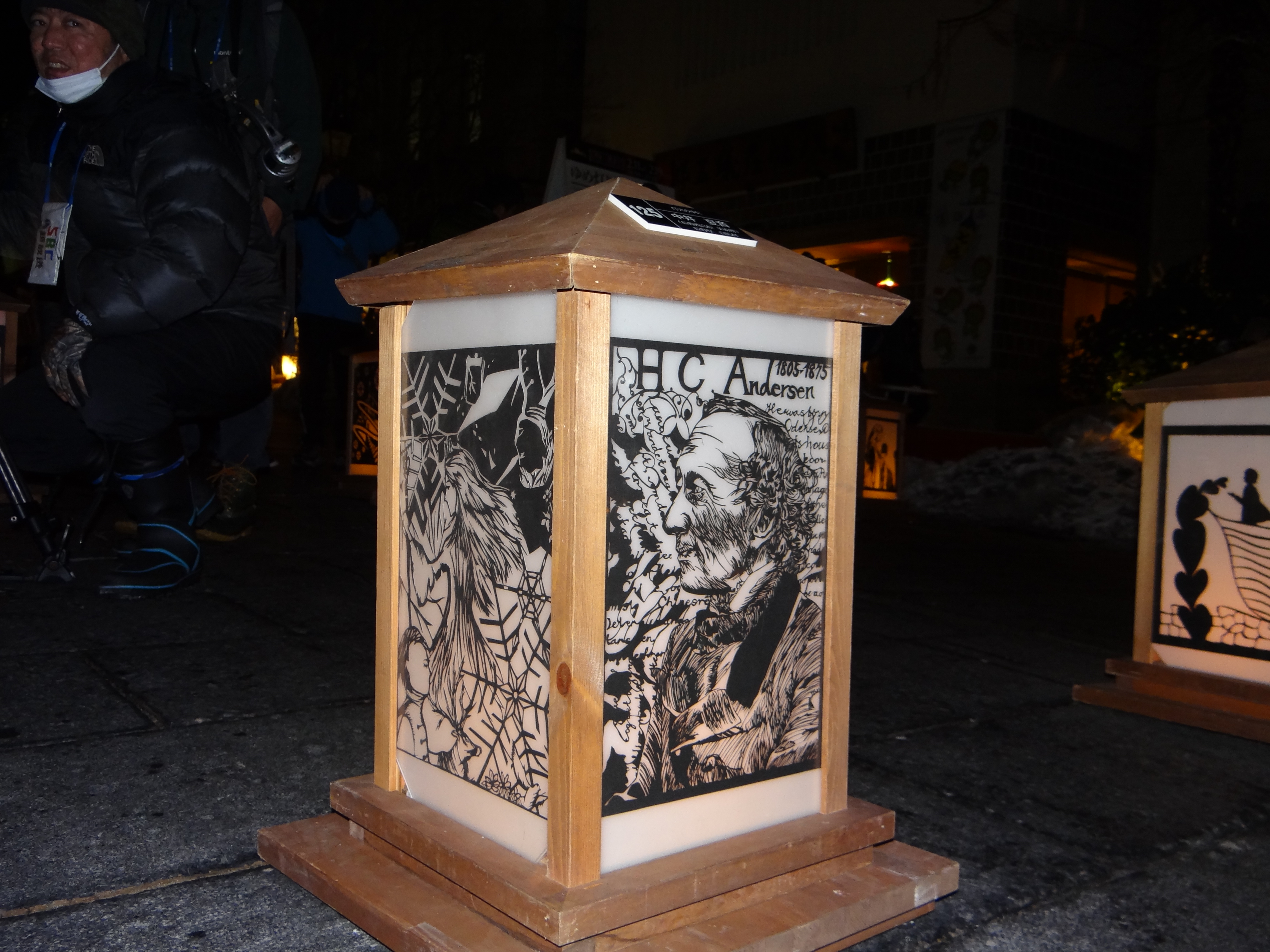 灯ろうには、「アンデルセン童話」、「愛」、「平和」の今年の絵柄のテーマの個性あふれる切り絵が、灯りによって浮かび上がる。