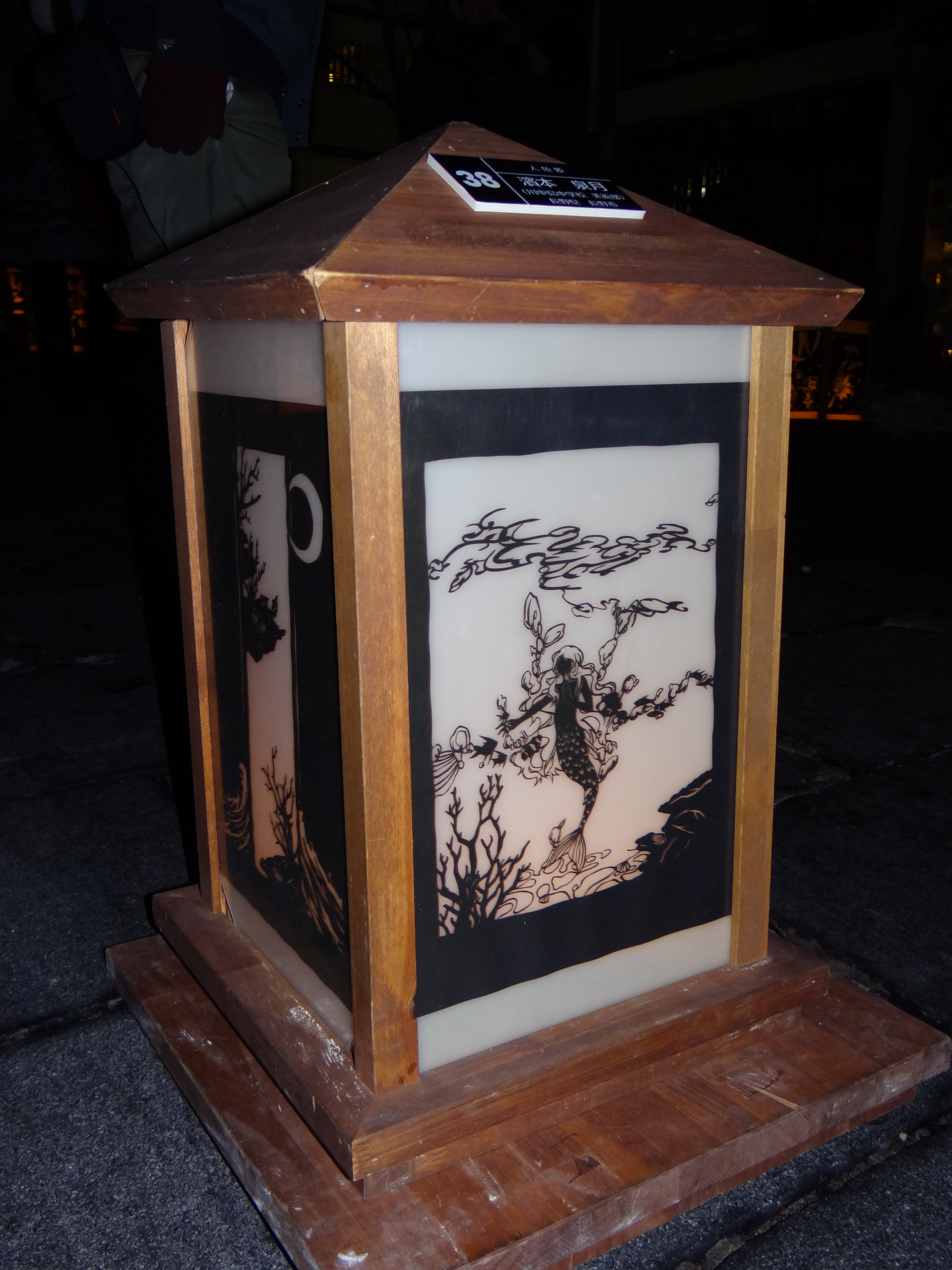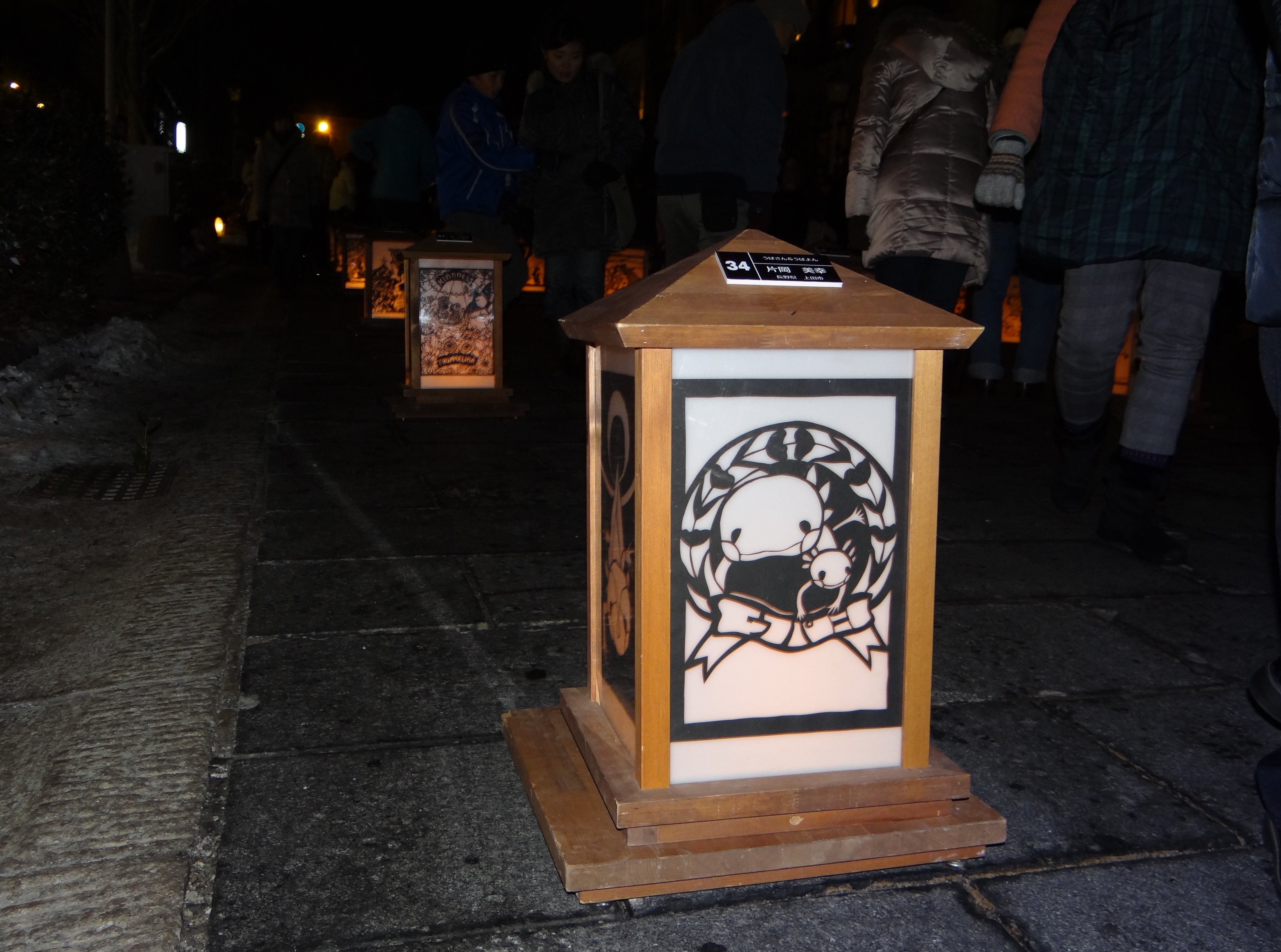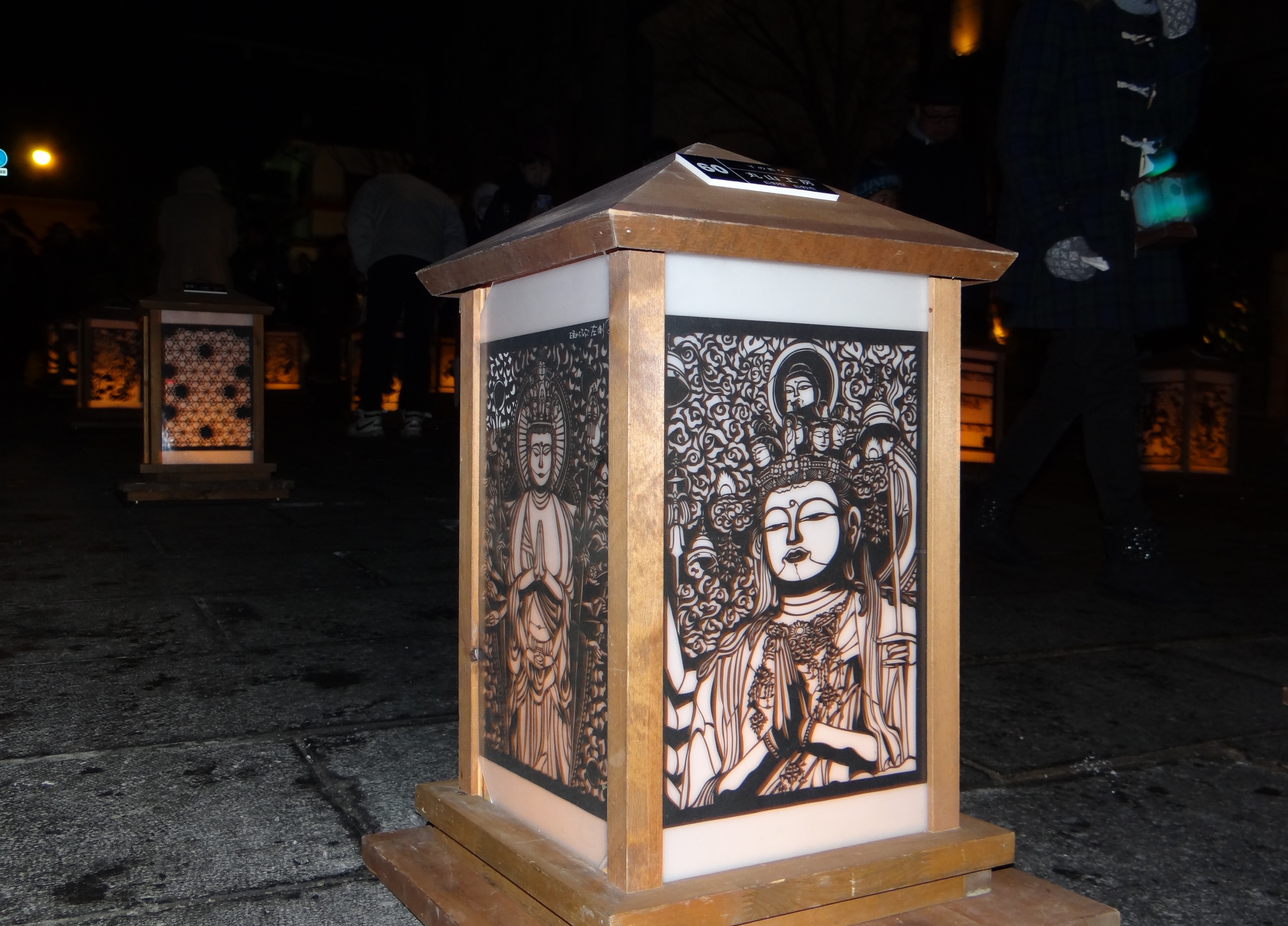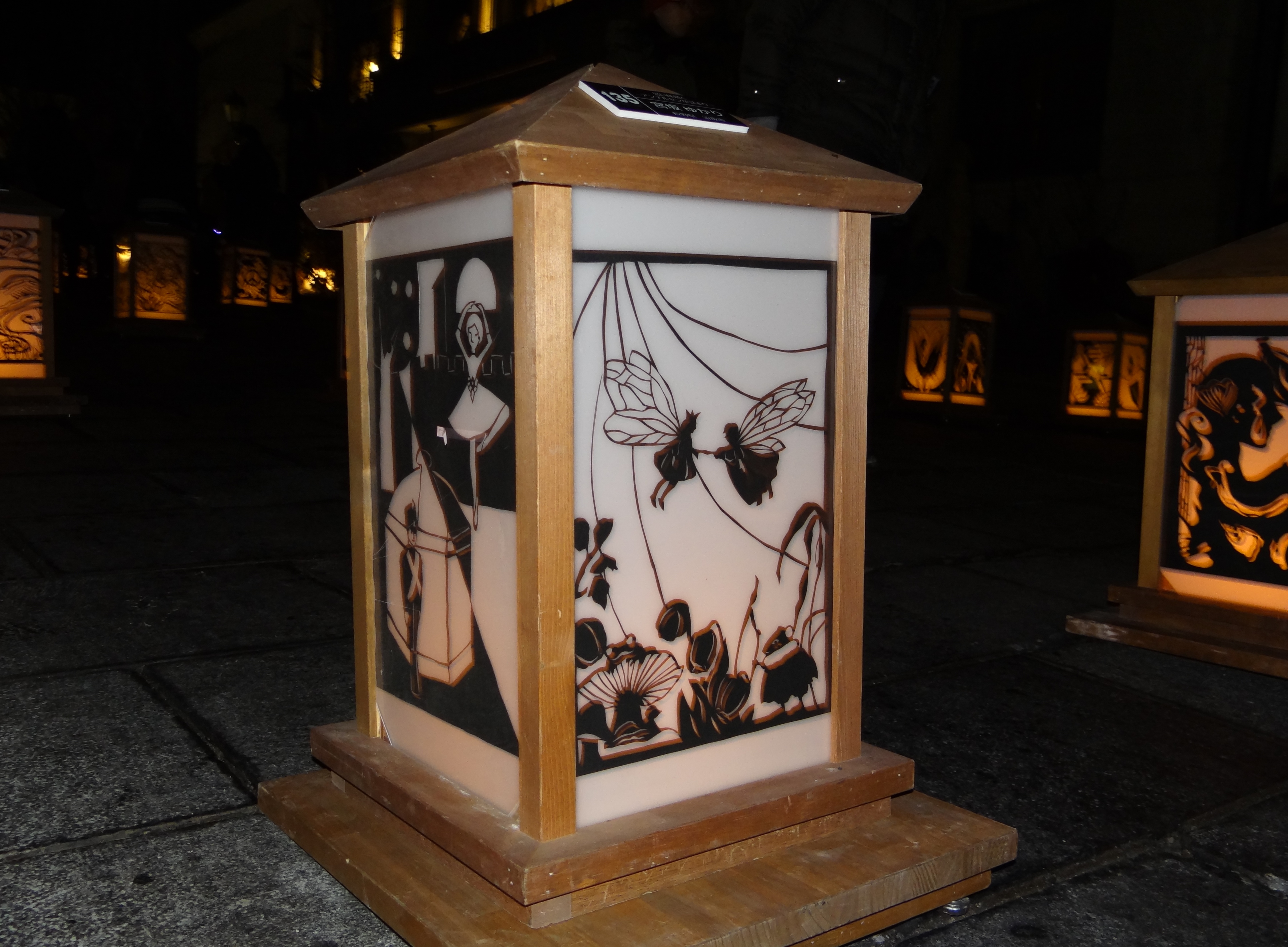 灯ろうには、「アンデルセン童話」、「愛」、「平和」の今年の絵柄のテーマの個性あふれる切り絵が、灯りによって浮かび上がる。