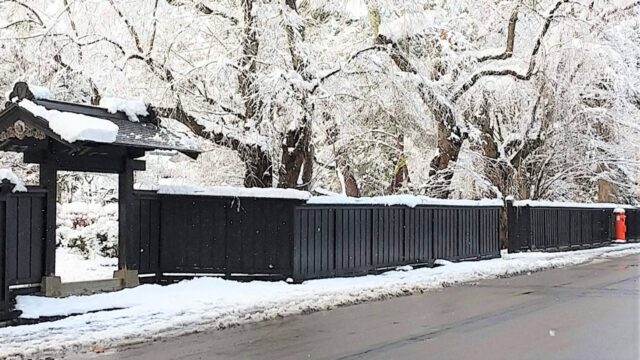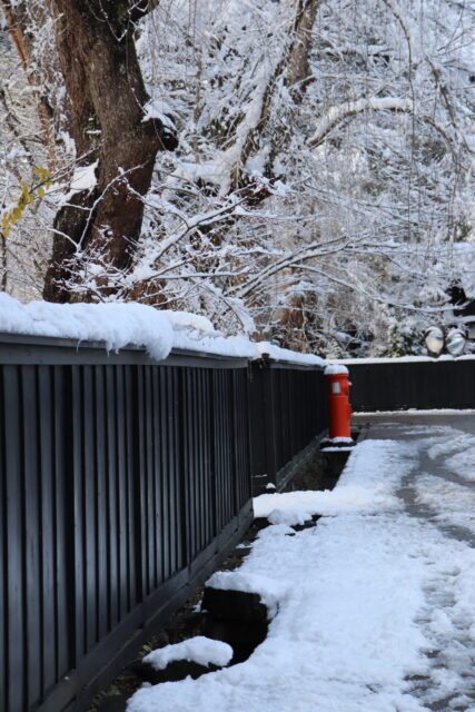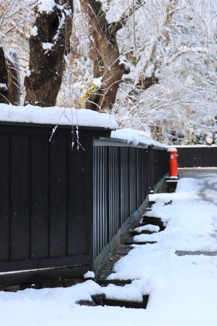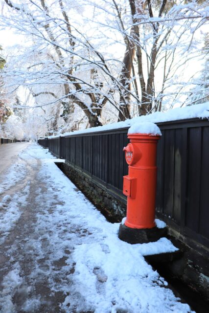 白い花の老木と黒塀の武家屋敷通りはまるで水墨画の世界で、ぽつんと立つ真っ赤なポストがアクセントとなって存在感がありました。