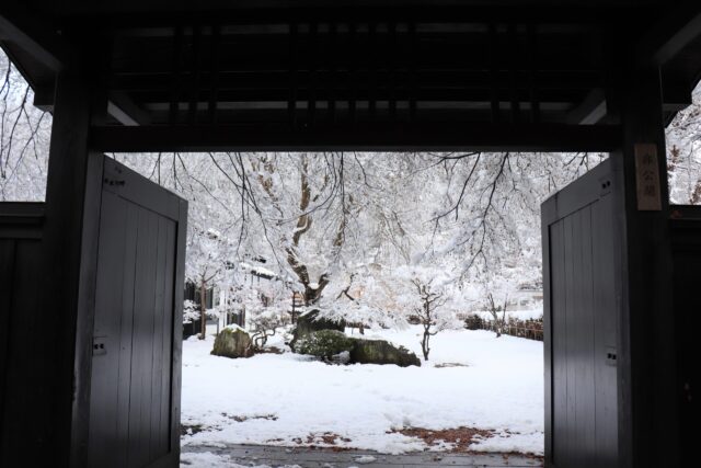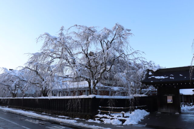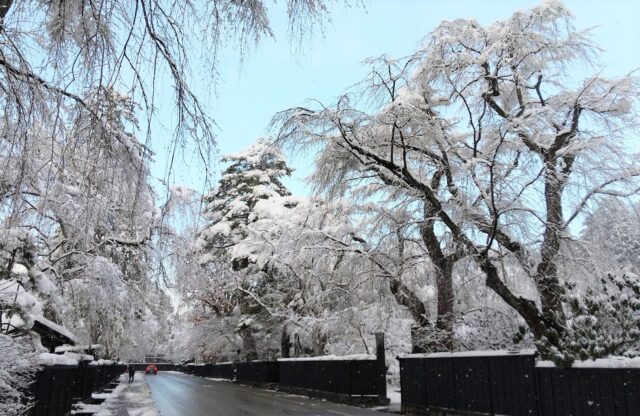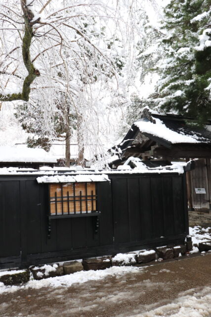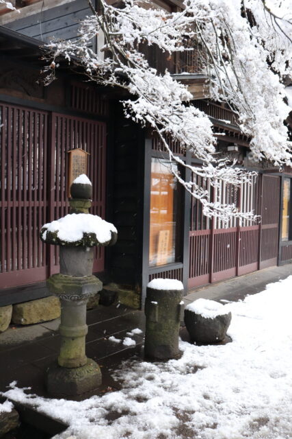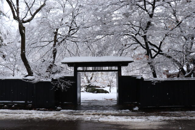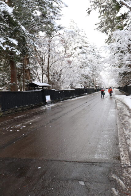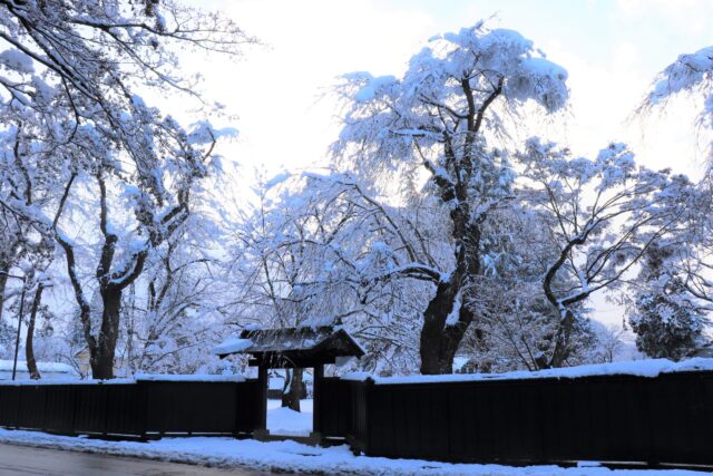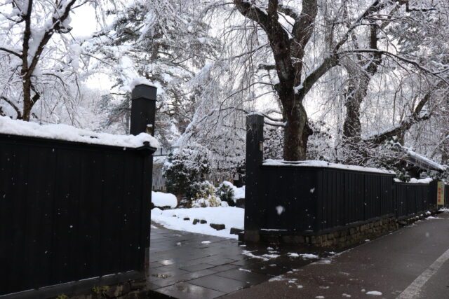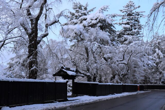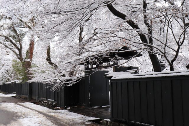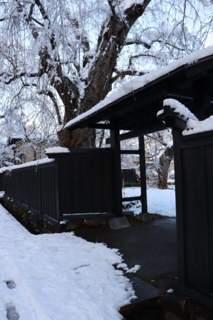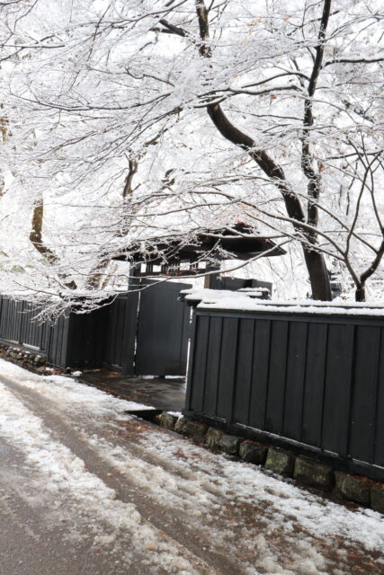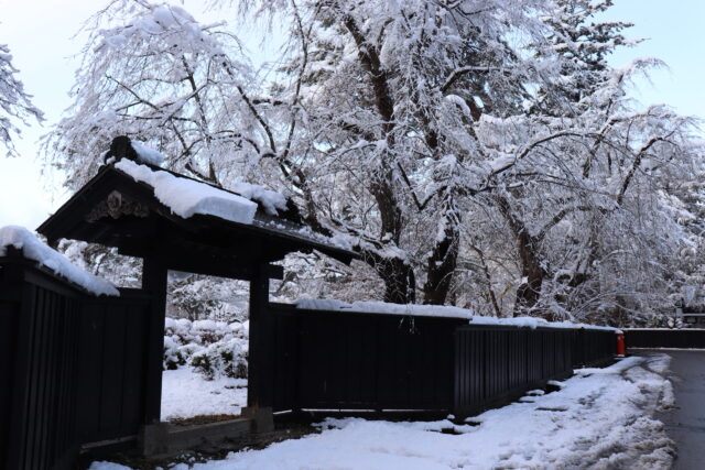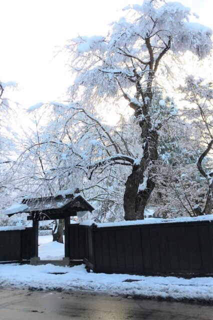 風がなく静かに雪がちらつく中を散策。昨日から老木に降り積もった白い雪の花が、地味な武家屋敷通りを演出してくれていました。