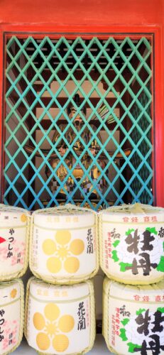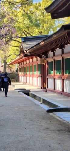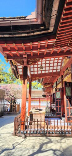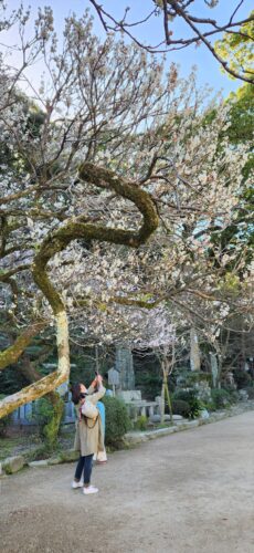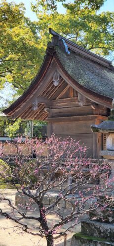 境内の満開に咲いている梅の花を見て、菅原道真の有名な和歌を思い出す。