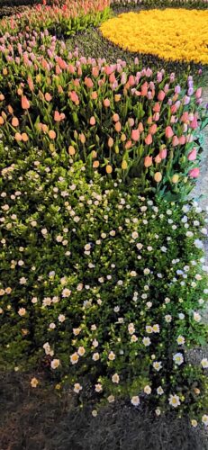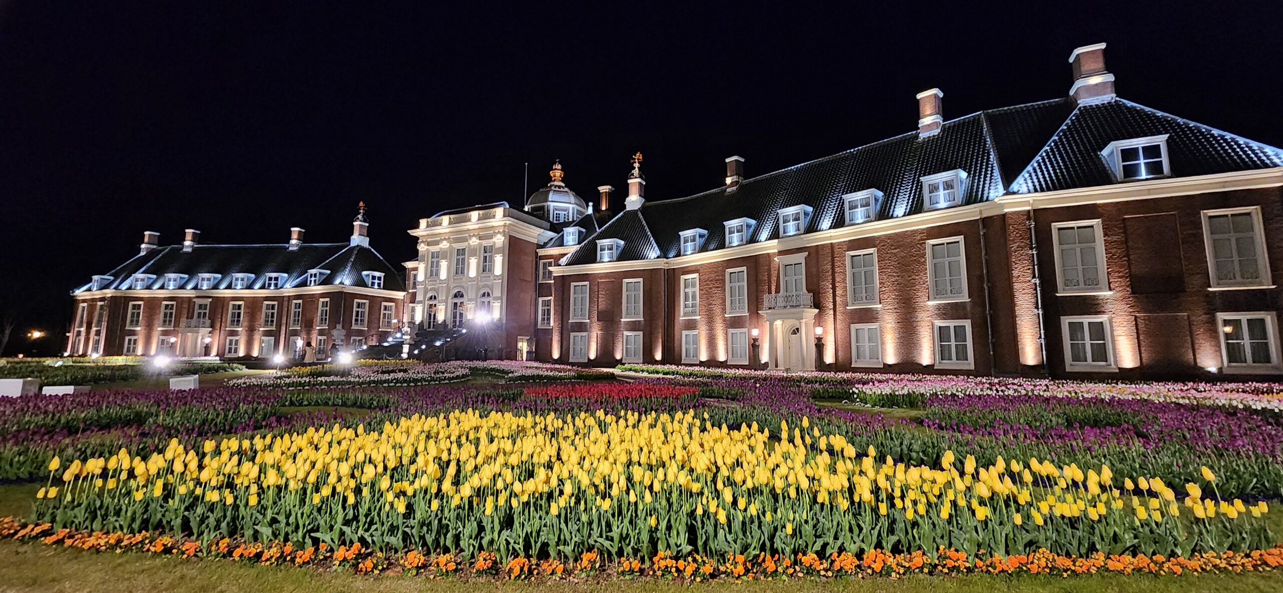 美しく大きな洋風建物の姿、そして色とりどりのチューリップが一面に敷き詰められ、スケールの大きさと見事な美しさに圧倒されました。