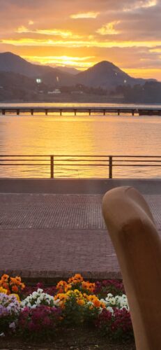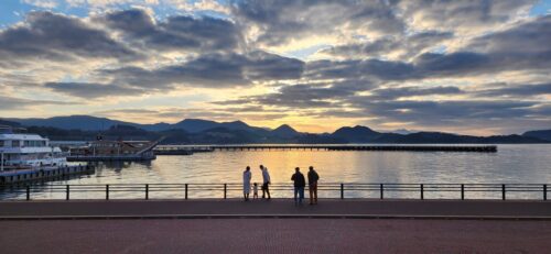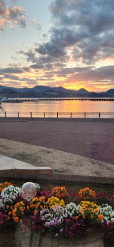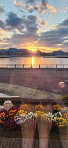 朝6時半からバイキング。レストラン席から大村湾に朝日が登って来るのを見ながら頂きました。