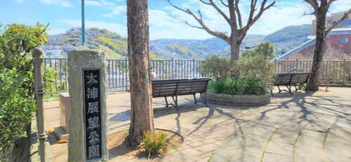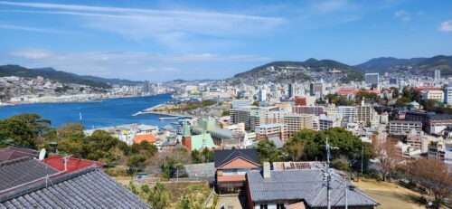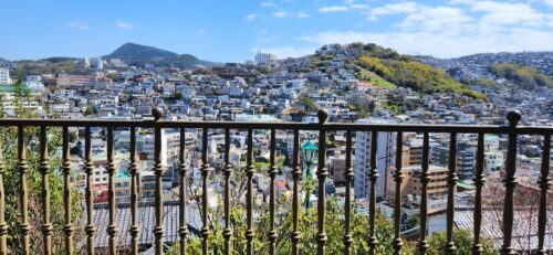 こちらは途中、お寺・神社・教会の3つの文かが寄り添っている「祈りの三角ゾーン」を過ぎ、「祈念坂」を上り切ったら「大浦展望公園」に着きます。ベンチが二つ置かれている小さな公園ですが、そこから傾斜地にぎっしりと家々が建つ街の景色を見渡すことができます。