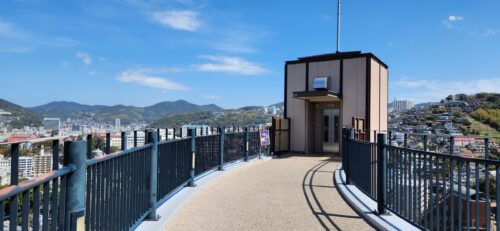 しばらく上って行くと「垂直エレベーター」にたどり着きます。このエレベーターに乗り、降りたところからは長崎の港町が一望できる絶景が。